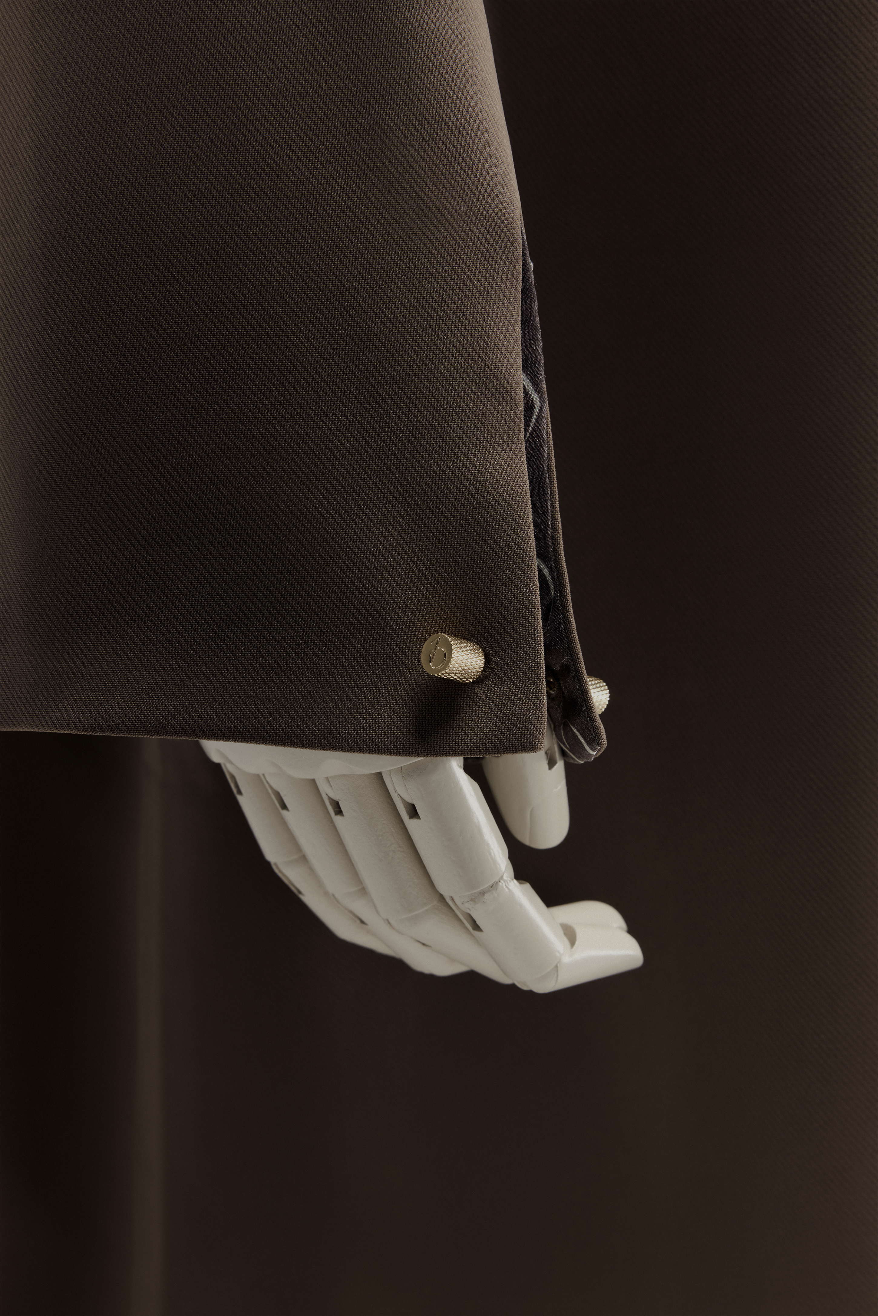 Wanneer de mouwen worden omgeslagen, komt de elegante voering prachtig naar voren en wordt deze vastgezet met een hoogwaardige roestvrijstalen pin in goud of zilver – meegeleverd bij aankoop.